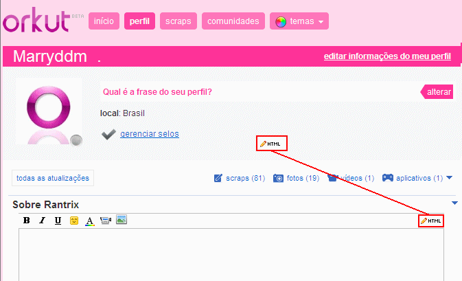 Acesse o seu Orkut e clique em Perfil (no menu superior). Para ativar o modo de edição do perfil clique na parte onde fica a sua descrição (quadro amarelo).